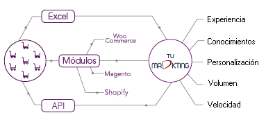 MÓDULO: tenemos módulos para Magento, Shopify o WooCommerce. Ellos pueden subir y administrar sus